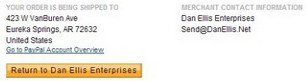 After payment is complete, you will recieve a "Thank You" notice which shows in the right bottom, a button displaying "Return to Dan Ellis Enterprises"